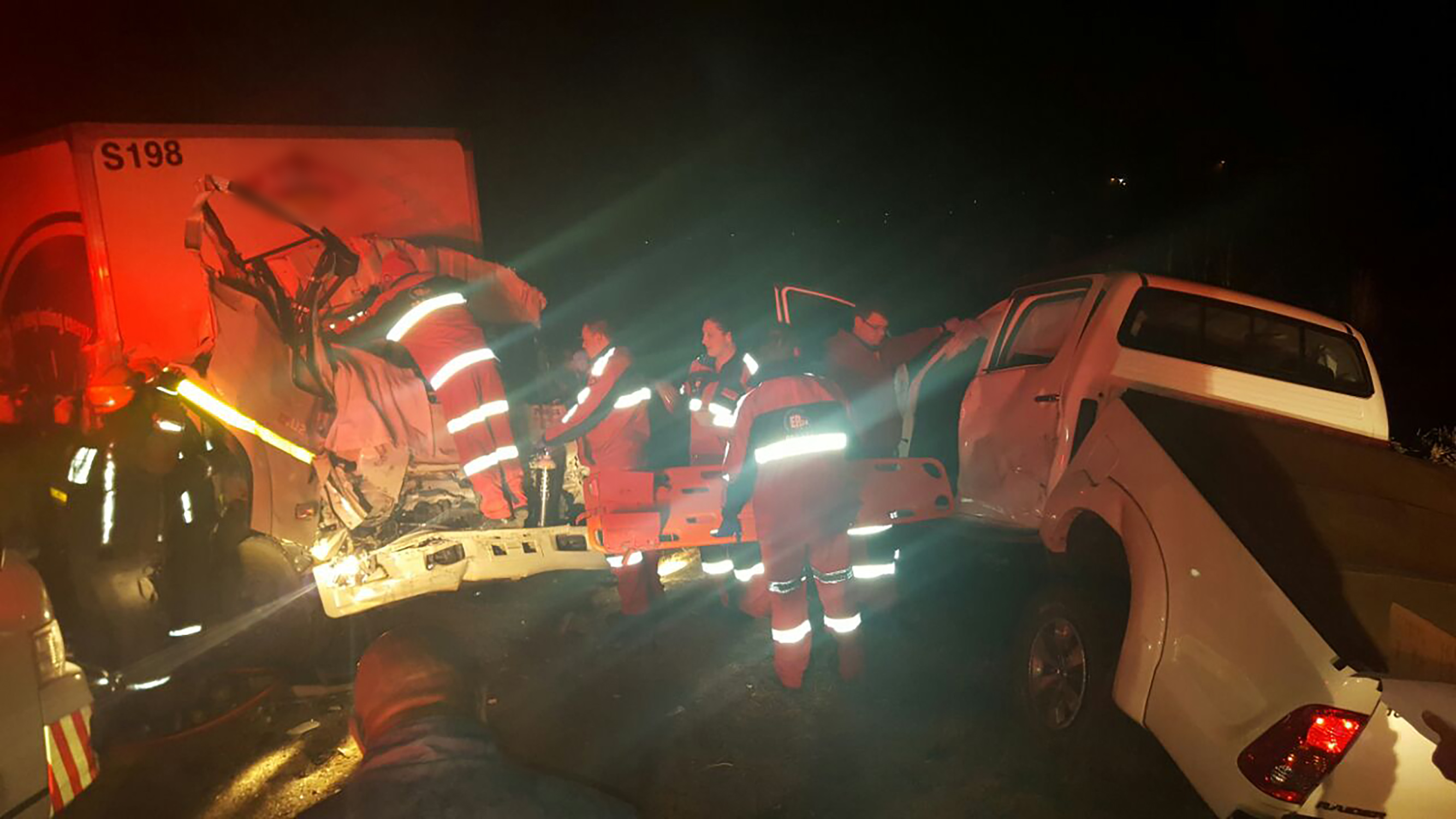 Paramedics arrived on the scene shortly after 04:00 this morning where they found the two vehicles mangled against each other. Three people, believed to be between 25 and 30 years old, were trapped in the cabin of the truck. All three sustained severe fractures and multiple lacerations. The local fire department had to use the jaws of life to free them from the wreckage. A man, believed to be in his thirties, was found trapped in the Toyota Hilux bakkie. The jaws of life was used to pry open his door before he could be extricated. He sustained possible back injuries.