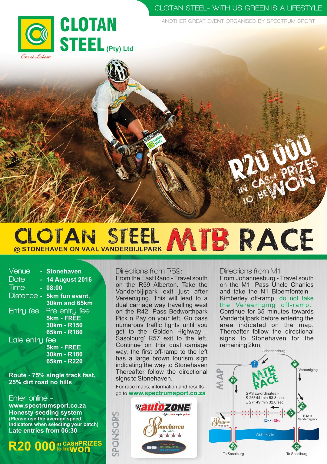 VANDERBIJLPARK. – Eerskomende Sondagoggend gaan die speke by Stonehaven on Vaal sing wanneer die tweede Clotan Steel Bergfietswedren oor 5km, 30km en 65km plaasvind. Sowat R20 000 se pryse is op die spel. Die wedrenne skop om 08:00 af en word in samewerking met Spectrumsport ten bate van die Lewensligsentrum vir gestremdes aangebied. Laat inskrywings …