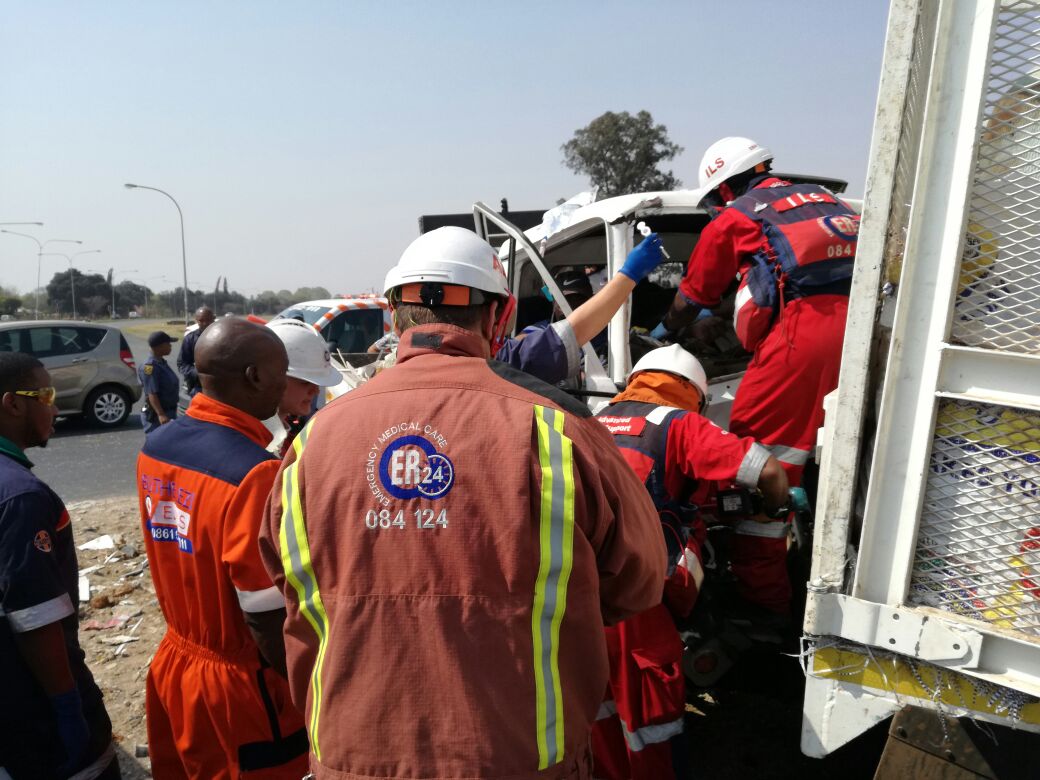 “ER24 paramedics, along with other services, arrived on the scene and found both trucks in the middle of the intersection.On further inspection, paramedics found that three men lay trapped in the first truck while, in the second truck, three women were found seated inside the vehicle,” says Meiring.