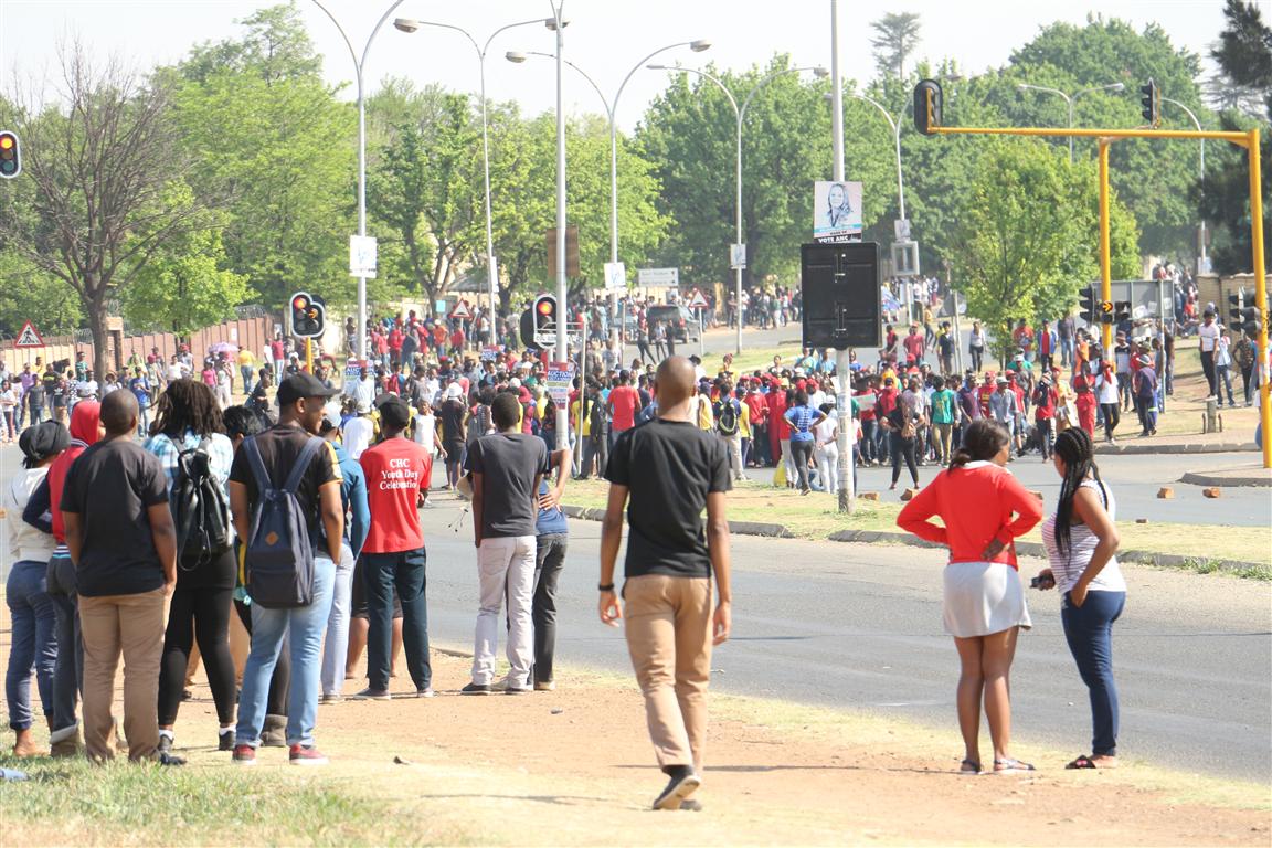 Police fired teargas to disoerse students as they attempt to advance to the main gate. Instead they run and scattered and they later organized in high volumes. The police decided to wait outside the main gate. Students started to leave in group. – Lazarus Dithagiso