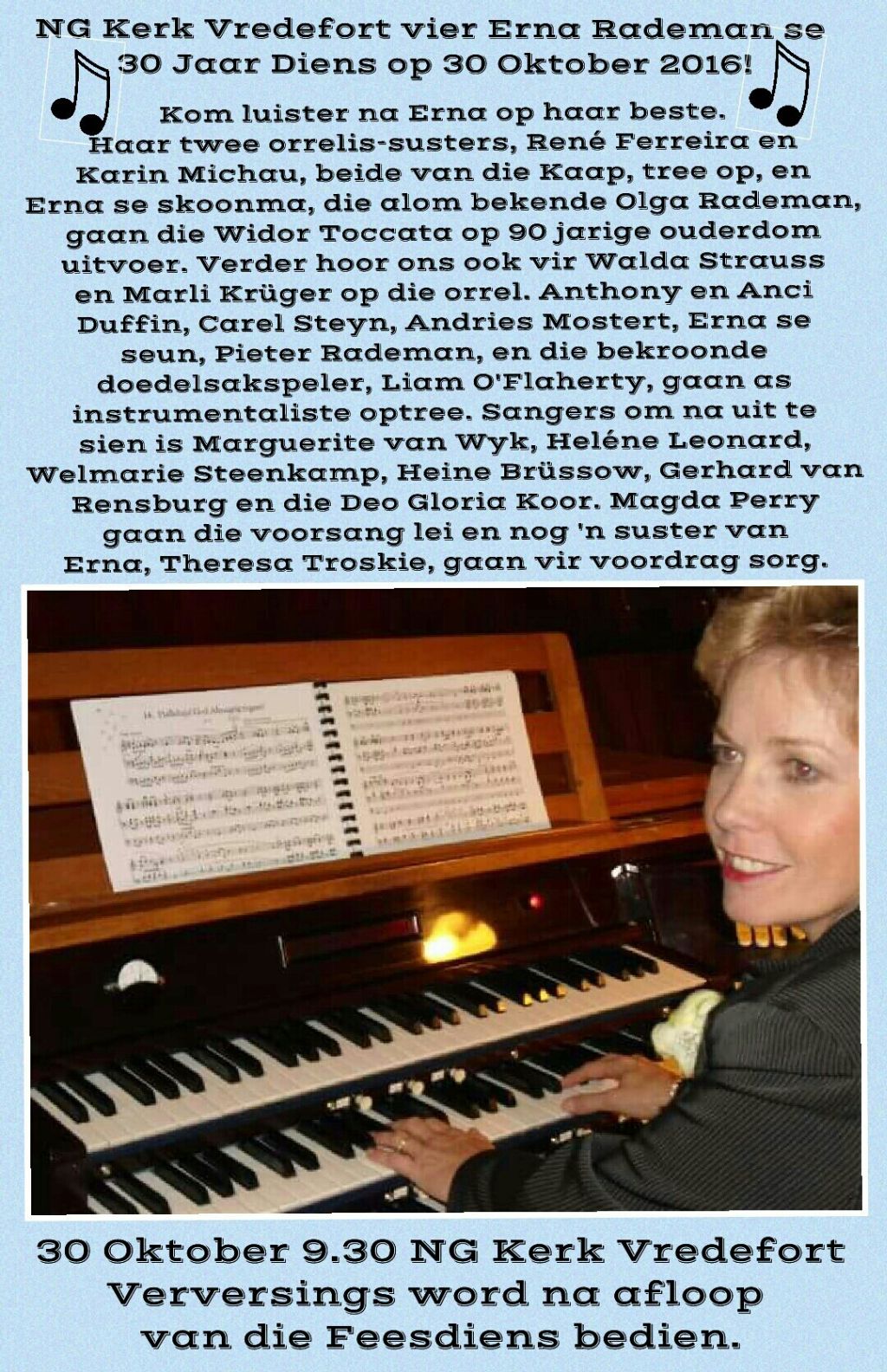 NG KERK Vredefort vier Erna Rademan se 30 Jaar diens op 30 Oktober 2016 om 9.30! Kom luister na Erna op haar beste. Haar 2 orrelis-susters, René Ferreira en Karin Michau, beide van die Kaap, tree op, en Erna se skoonma, die alom bekende Olga Rademan, gaan die Widor Toccata op 90 jarige ouderdom uitvoer. Verder hoor ons ook vir Walda Strauss en Marli Kruger op die orrel. Anthony en Anci Duffin, Carel Steyn, Andries Mostert, Erna se seun, Pieter Rademan, en die bekroonde doedelsakspeler, Liam O’Flaherty, gaan as instrumentaliste optree. Sangers om na uit te sien is Marguerite van Wyk, Heléne Leonard, Welmarie Steenkamp, Heine Brussow, Gerhard van Rensburg en die Deo Gloria Koor. Magda Perry gaan die voorsang lei en nog ‘n suster van Erna, Theresa Troskie, gaan vir voordrag sorg. Na afloop van die diens gaan verversings op eg plattelandse wyse bedien word. Geen toegang nie. Hierdie grootse geleentheid is vry, kosteloos, gratis en verniet!