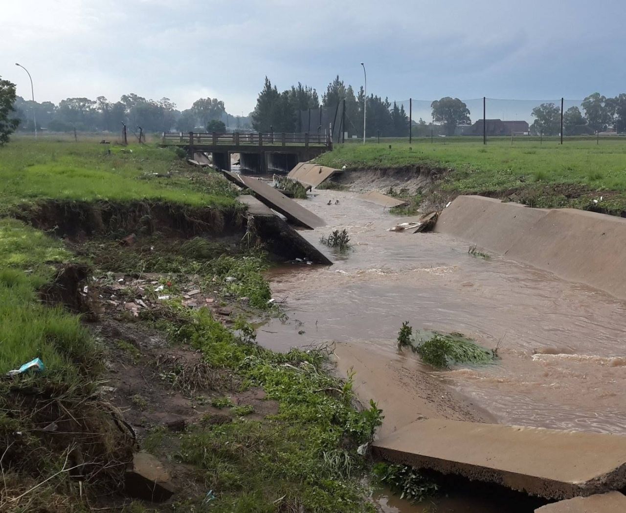 Die gebreekte betonblokke in die kanaal belemmer die vloei van stormwater en laat die water ook tydens swaar neerslae in die erwe en omliggende paaie opdam.