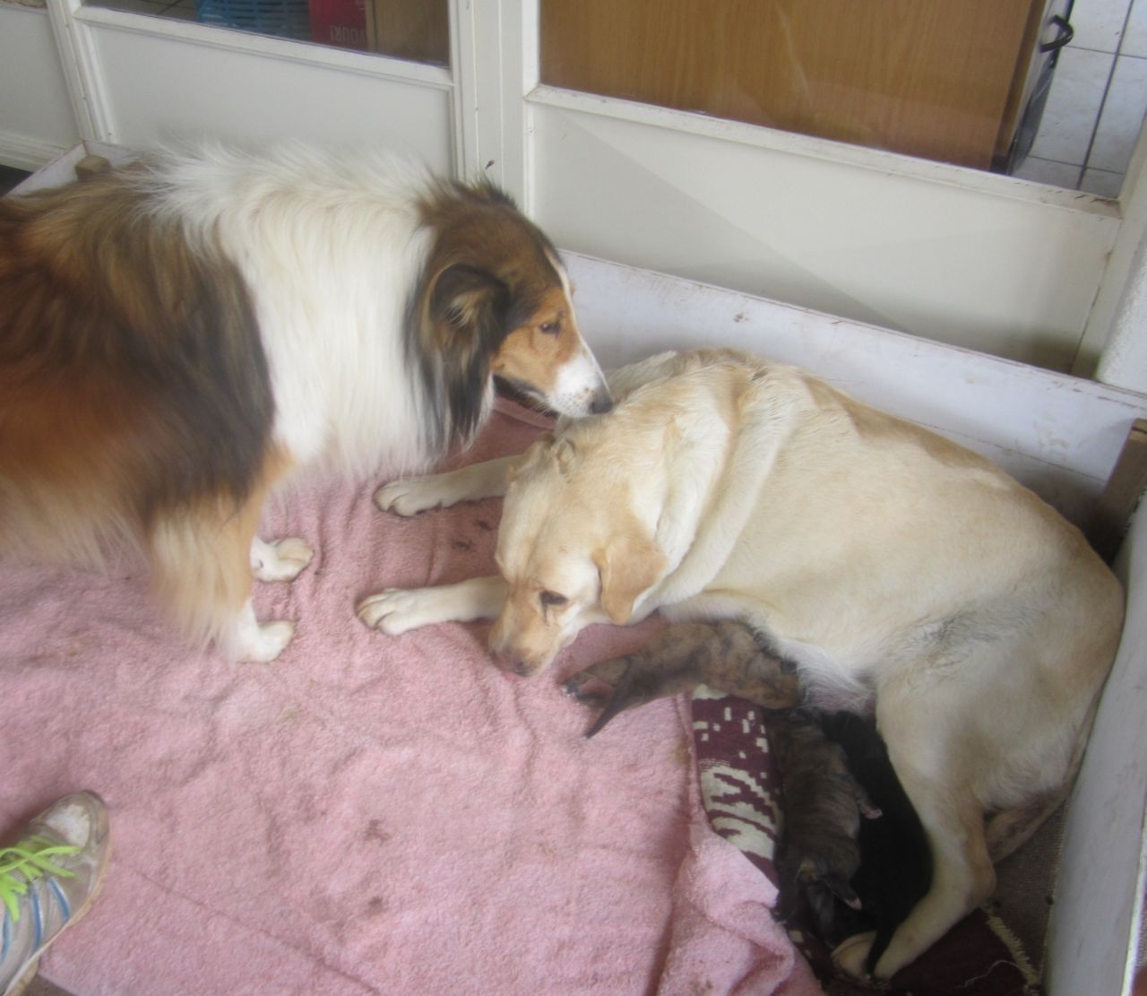 Omdat dit na die geboorte gelyk het of die Labrador ongemaklik was en pyn gehad het, het hulle haar na ‘n veearts geneem waar sy inspuitings en behoorlike behandeling gekry het.