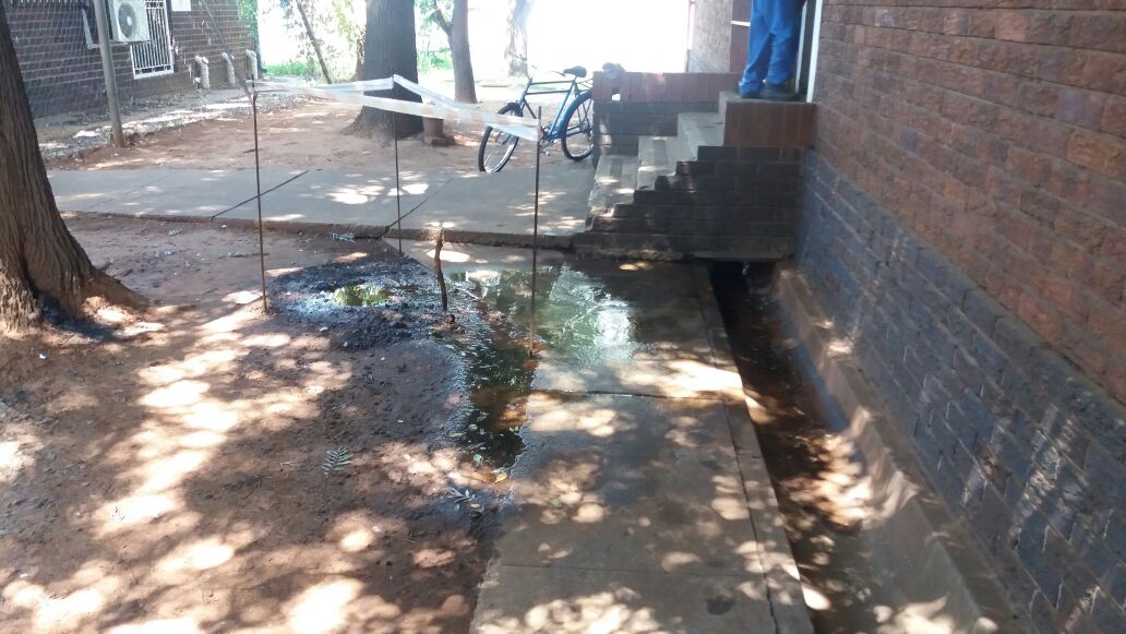 Die waterlek is skuins voor hul kantoordeur en dit is vermoedelik ‘n lek op die brandkraan se toevoer.