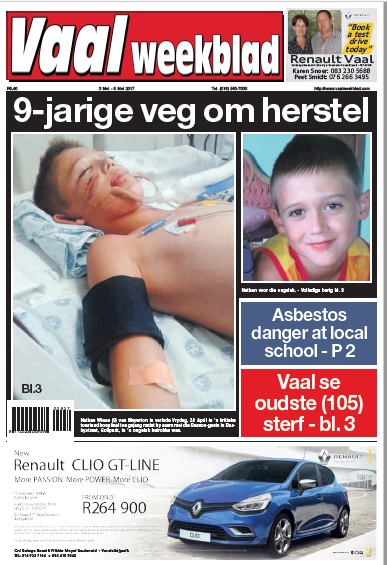 * ‘n Negejarige seun, Nathan Wiese van Meyerton, lê ernstig beseer in die Charlotte Maxeke-hospitaal aan die Rand na ‘n motorongeluk die afgelope naweek. Sy gesin wil hom graag na die Vaaldriehoek laat oorplaas maar benodig R200 000 vir sy versorging in ‘n plaaslike waakeenheid.