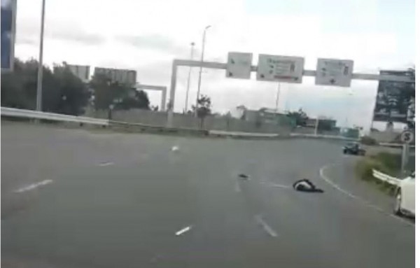 Die persoon wat die video geneem het, klim uit sy voertuig en gaan na die voertuig wat stilstaan. Met die gewaar hy die persoon wat in die pad lê. Hy klop aan die venster van die stilstaande voertuig. Die vrou in voertuig kry nie ‘n woord uit nie.