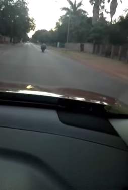 In die Video wat deur Maroela Media gedeel is kan jy sien hoe twee mense op ‘n bromponie ‘n wye draai neem om verby die seekoei te ry en dan draf hy boonop nog na hulle kant toe ook.
