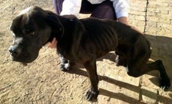 Hond byna deur groep mans gestenig; nou spekvet en gesond