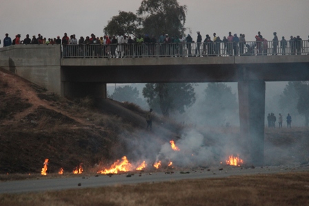 MEYERTON. - Terwyl motoriste met hul hande in hul hare sit oor die R59 wat gesluit is tussen die Johan le Roux- en Meyer-afrit, wag inwoners van Sicelo vir LUR Paul Mashatile om hulle terugvoering te gee oor sy belofte dat daar aan hulle grond (land) voorsien sal word.