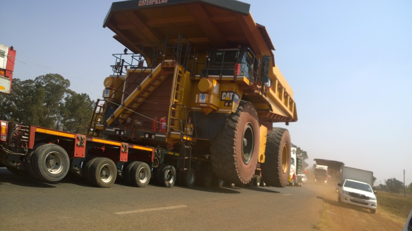 Die vier myn “dumpers” het gesorg vir ‘n opeenhoping van verkeer en verbaasde oop monde op die R42 vanaf Barrage se rigting en het noord gedraai by die kruising van die dood op die R57 rigting Johannesburg. ‘n Hele aantal ondersteuningsvoertuie asook verkeersmotors het die vier bulle vergesel. Ongelukkig is die oorsprong en eindbestemming onbekend. Personeel moes verskeie plekke telefoondrade lig om hierdie menere onderdeur te laat ry. Die vier bulle lê op hul pense op lae bed vragmotors en loop feitlik twee bane wyd. Volgens nuwe inligting kom hulle van Kathu af en is oppad Mpumalanga toe. Hulle het die Vrydag voor dit vertrek en kan slegs 60km p/h ry. Een van die mine dumpers alleen weeg 150 ton