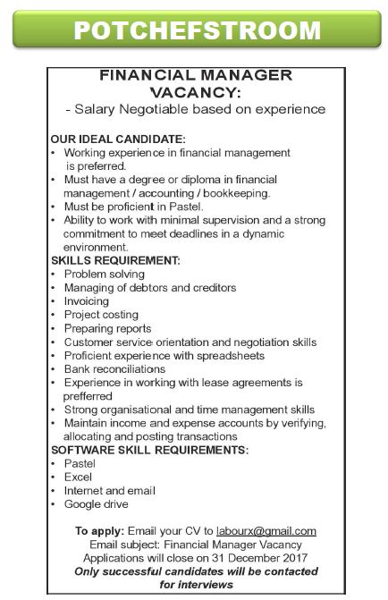 Home/Lifestyle/Vacancy for Financial Manager – Potch Lifestyle Vacancy for Financial Manager – Potch Vacancy for Financial Manager - Potch December 14, 2017 Online Team Less than a minute Facebook X LinkedIn Tumblr Pinterest WhatsApp Telegram Share via Email Print December 14, 2017 Online Team Less than a minute Facebook X LinkedIn Tumblr Pinterest WhatsApp Telegram Share via Email Print