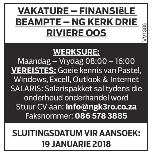 Finansiële beampte benodig – Drie Riviere