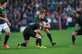 Die Springbokslot Eben Etsebeth hardloop bo-oor ‘n All Black verdediger tydens Saterdag se toets tussen Suid-Afrika en Nieu-Seeland . Foto: Ettienne van Rensburg