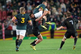 Cornal Hendricks vleuel van die Sprinbokke word in die lug gespeel nadat hy ‘n hangskop bemeester het. Foto: Ettienne van Rensburg