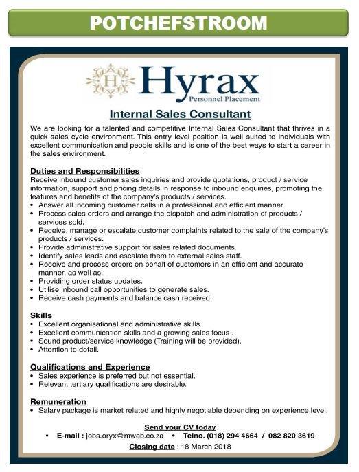 Potchefstroom: Hyrax, Internal Sales Consultant