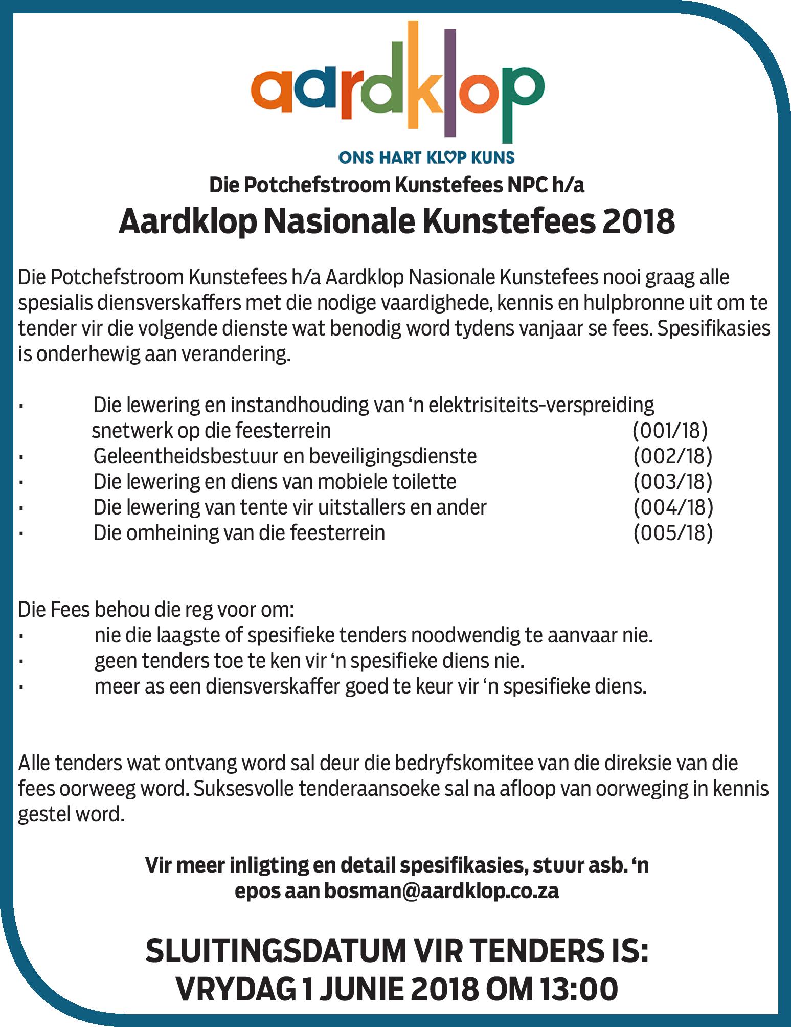 Home/Ads/Aardklop: Die Potcefstroom Kunstefees nooi tenderaars vir spesialis diensverskaffing. AdsLifestyleNewsSponsored Aardklop: Die Potcefstroom Kunstefees nooi tenderaars vir spesialis diensverskaffing. May 17, 2018 Aardklop: Die Potcefstroom Kunstefees nooi tenderaars vir spesialis diensverskaffing. Less than a minute Facebook X LinkedIn Tumblr Pinterest WhatsApp Telegram Share via Email Print At Caxton, we employ humans to generate daily fresh news, not AI intervention. Happy reading! May 17, 2018 Aardklop: Die Potcefstroom Kunstefees nooi tenderaars vir spesialis diensverskaffing. Less than a minute Facebook X LinkedIn Tumblr Pinterest WhatsApp Telegram Share via Email Print