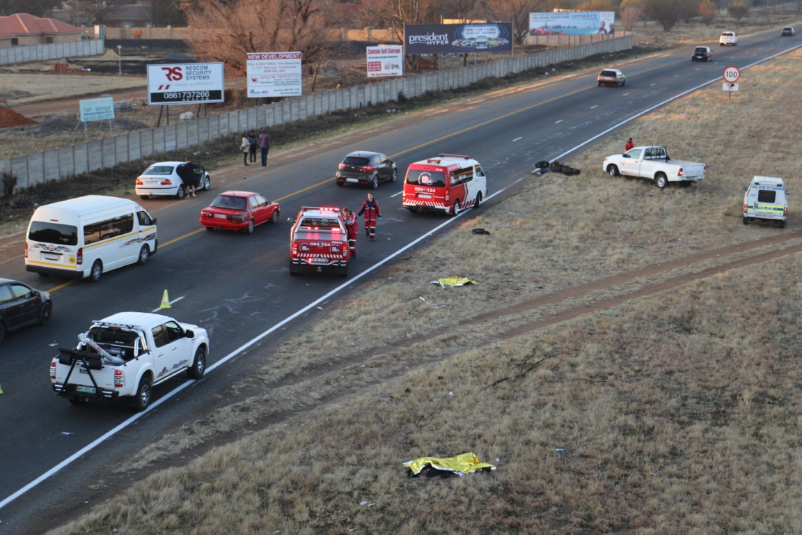 Die ongeluk het ongeveer 06:30 gebeur toe vrou in haar laat twintigs of vroeë dertigs, voor die motorfietsryer wat in die rigting van Sasolburg op pad was, oor die pad gehardloop het. Die vrou is opslag dood nadat haar linkerbeen afgeruk is en haar been het sowat dertig meter verder van haar liggaam gelê. Die motorfietsryers is ernstig beseer en is op die toneel deur ER24 paramediese personeel behandel en na die hospitaal geneem vir behandeling. Hy het sowat 70m van die inpakpunt gelê. Die motorfiets, wat ‘n ent verder af as sy bestuurder gelê het, het baie skade opgedoen. Verkeer in die rigting van Sasolburg was ‘n tyd lank ontwrig terwyl forensiese deskundiges hul afmetings en fotos op die toneel gedoen het.