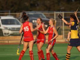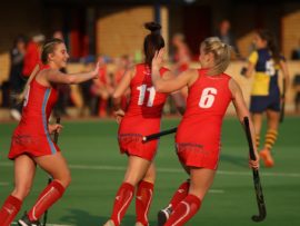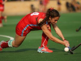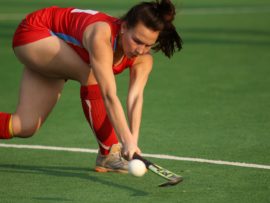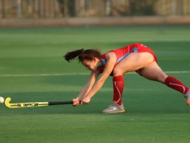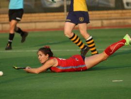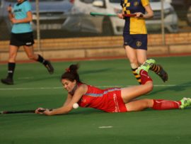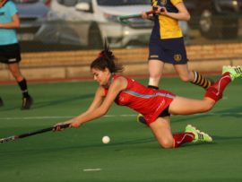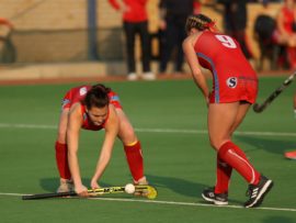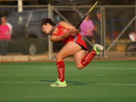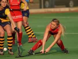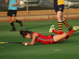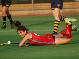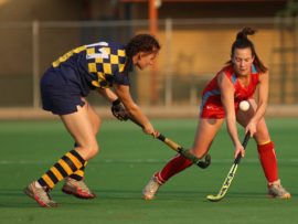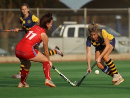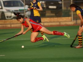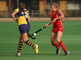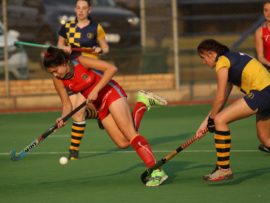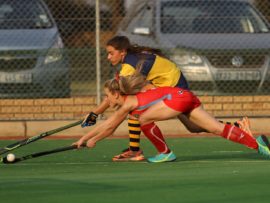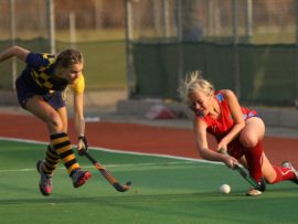 Angelique Roelofse van Hoërskool Transvalia se eerste hokkiespan word deur ‘n speler van Kempton Park binne die doelsirkel gepootjie. Transvalia het die belangrike Noordvaal uitspeelwedstryd vir grootskole met 3-0 gewen om deur te dring tot die volgende ronde wat van 9 – 11 Augustus plaasvind.
