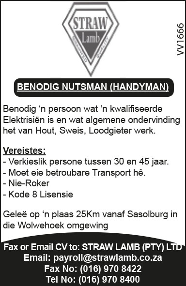 Home/Ads/Straw Lamb: Benodig Nutsman (Handyman). AdsLifestyleNewsSponsored Straw Lamb: Benodig Nutsman (Handyman). August 22, 2018 Straw Lamb: Benodig Nutsman (Handyman). Less than a minute Facebook X LinkedIn Tumblr Pinterest WhatsApp Telegram Share via Email Print At Caxton, we employ humans to generate daily fresh news, not AI intervention. Happy reading! August 22, 2018 Straw Lamb: Benodig Nutsman (Handyman). Less than a minute Facebook X LinkedIn Tumblr Pinterest WhatsApp Telegram Share via Email Print