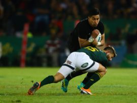 Handre Pollard trying his best to stop an All Black.