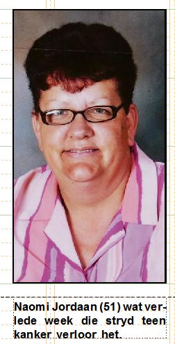 Naomi Jordaan (51), het 25 jaar gelede kanker gekry en nadat sy vir jare met verskeie soorte kankers moes saamleef, het sy verlede week die stryd teen kanker verloor. Naomi was die afgelope vier jaar by die skool se naskoolsentrum betrokke en was baie geliefd onder die gemeenskap en die kinders. Sy het voorheen vir drie jaar by die Beertjie Kleuterskool in Vanderbijlpark gewerk.Vriende, kinders en familie sal haar onthou as ‘n baie vriendelike en behulpsame vrou en goeie ma vir haar eie- en ander se kinders.‘n Begrafnisdiens vind plaas op 28 Augustus om 12:00 uit die Lede vir Christus Kerk in President Boshoffstraat, SE1 in Vanderbijlpark gehou. Naomi word oorleef deur haar man Ben, drie dogters en vyf kleinkinders.