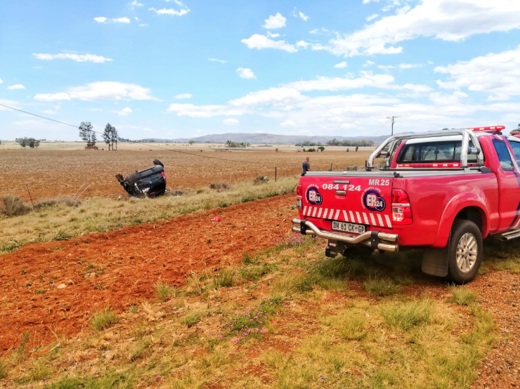 ER24 paramedics arrived on the scene at approximately 11h00 to find a light motor vehicle lying on its roof on the side of the road. The occupants were found lying around the vehicle.