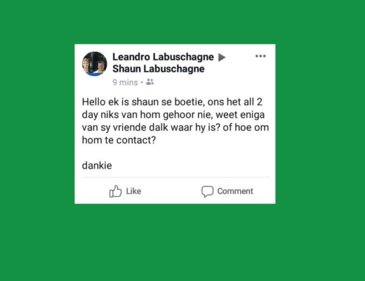 Share asseblief so veel as moontlik. Shaun Labuschagne word al vir meer as 2 dae vermis. Sy familie is bekommerd en het al ‘n saak aangemeld by die polisie. Hy is laaste in Vereeniging gesien. As enigiemand dalk inligting het of weet waar hy is, kontak asb +61412583306 of stuur ‘n Facebook-boodskap aan Noalleen Labuschagne. Baie dankie.