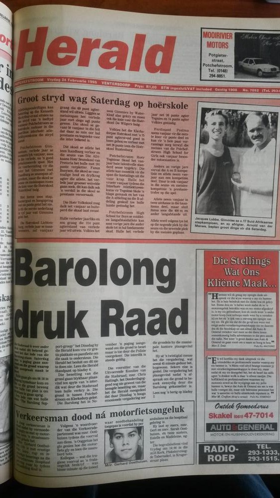 In die uitgawe van 24 Februarie 1995 berig die Herald op die voorblad dat die Barolong die stadsraad weer onder druk plaas oor die grond ten weste van Potchefstroom.