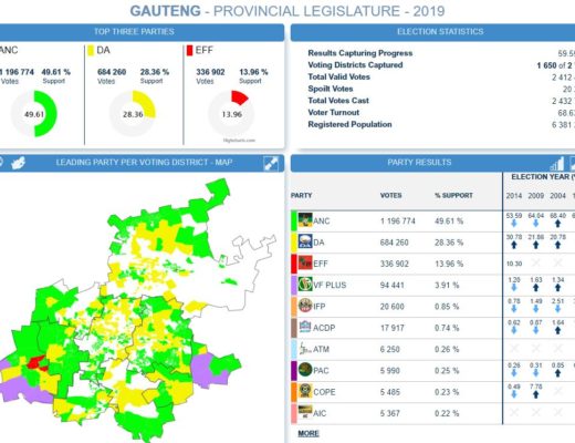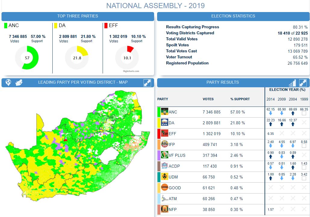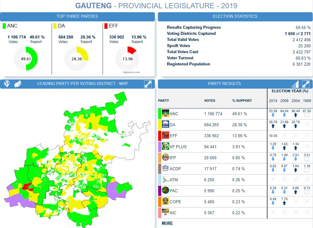 Verkiesings uitslae na 80.56% Nasionaal en 59.76% vir Gauteng