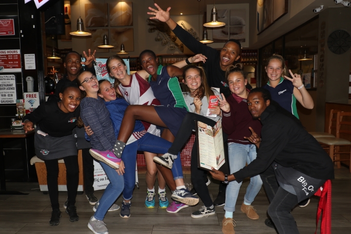 Luane Smith en Dudu Malindi in die middel van die foto saam met spanmaats en kelners van Panarottis hier in die Vaal Mall om ‘n ekstra geldjie te verdien om aan die SA netbaltoernooi deel te neem. Foto: Jannie du Plessis
