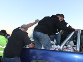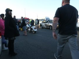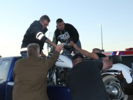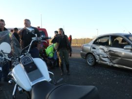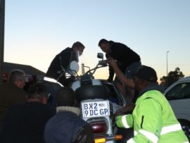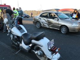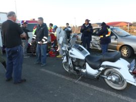 Awie van Rooyen (50), was net voor 17:00 in ‘n Noordelike rigting op pad met sy Suzuki Intruder LC toe ‘n vrou met twee passasiers in ‘n Kia Rio RS vanaf die winkel oorkant die Shellvulstasies, voor hom ingedraai het. Die motorfiets het teen die regterkant van die voertuig gebots en Awie is van sy motorfiets afgeslinger waar hy sowat 5m van die motorfiets in die pad bly lê het.