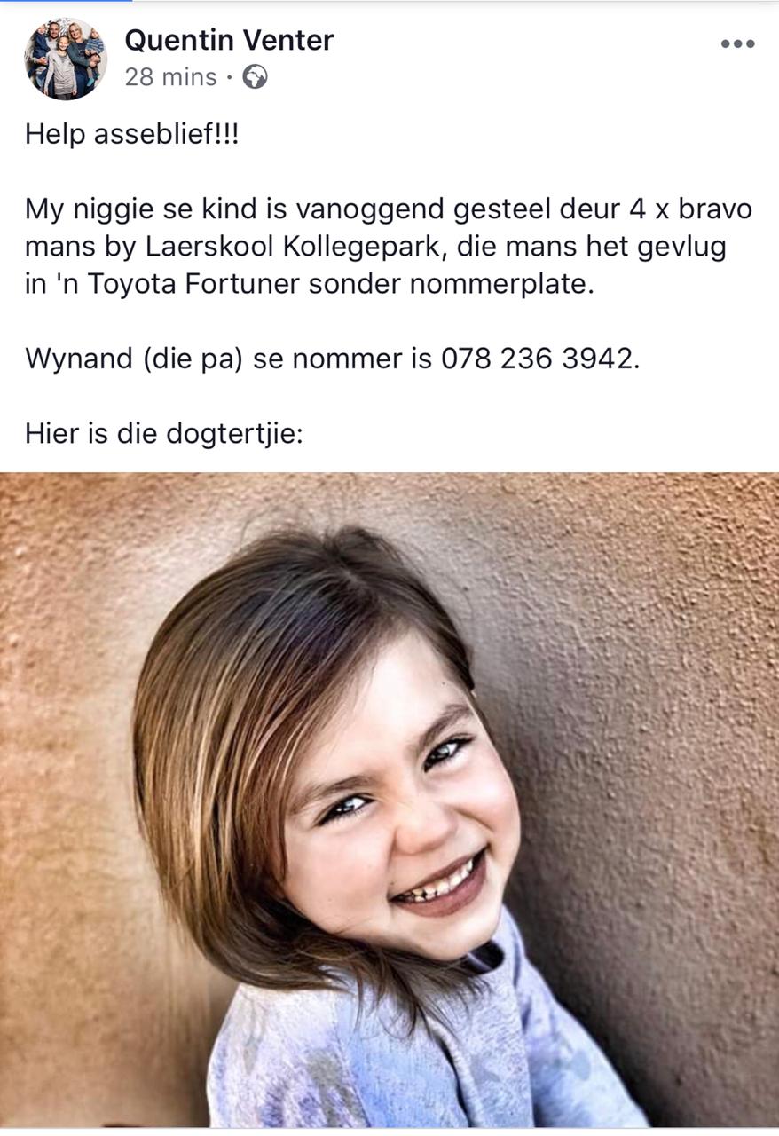 “Ek het eers gedink dit was haar voertuig wat hulle gevat het.” “Terug buite het die vrou gesê hulle het haar kind by haar gegryp en in die Fortuner gelaai en weggejaag. Verder het ek nie veel meer gesien nie,” vertel Annemarie.