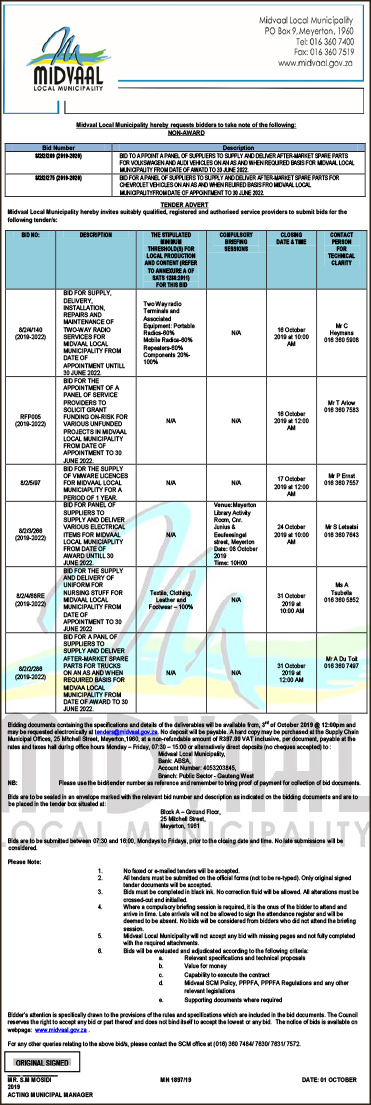 Midvaal Local Municipality. Bidder notice.