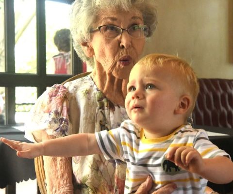 Hunter de Waal (1), op haar skoot tydens haar 90ste verjaardagpartytjie by Anna’s Kitchen in Drie Riviere.