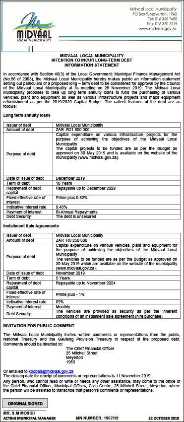 Midvaal Local Municipality intention to incur long-term debt information statement