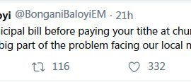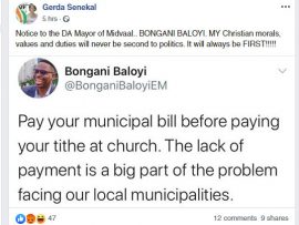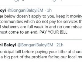 “Pay your municipal bill before paying your tithe at church. The lack of payment is a big part of the problem facing our local communities,” Baloyi wrote on Twitter.