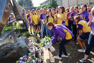 Nou sal die skool hoop vir die land bring.” Al die leerlinge, die onderwysers en die besoekers het hul hande spontaan opgesteek toe Willem ‘n “onsie” vat om vir die wêreld te wys dat Hoërskool Driehoek nou ‘n skool van hoop is. Na die diens het die leerlinge en onderwysers in stilte die saal verlaat waarna die vier kranse by die nuwe gedenk-kunswerk neergelê is deur die hoofleiers. Na ‘n paar minute stilte het almal na hul klasse verdaag. ‘n Mens kon sien dat die emosies diep gesny het, maar ten spyte van rooigehuilde oë, het almal hul koppe hoog gehou.