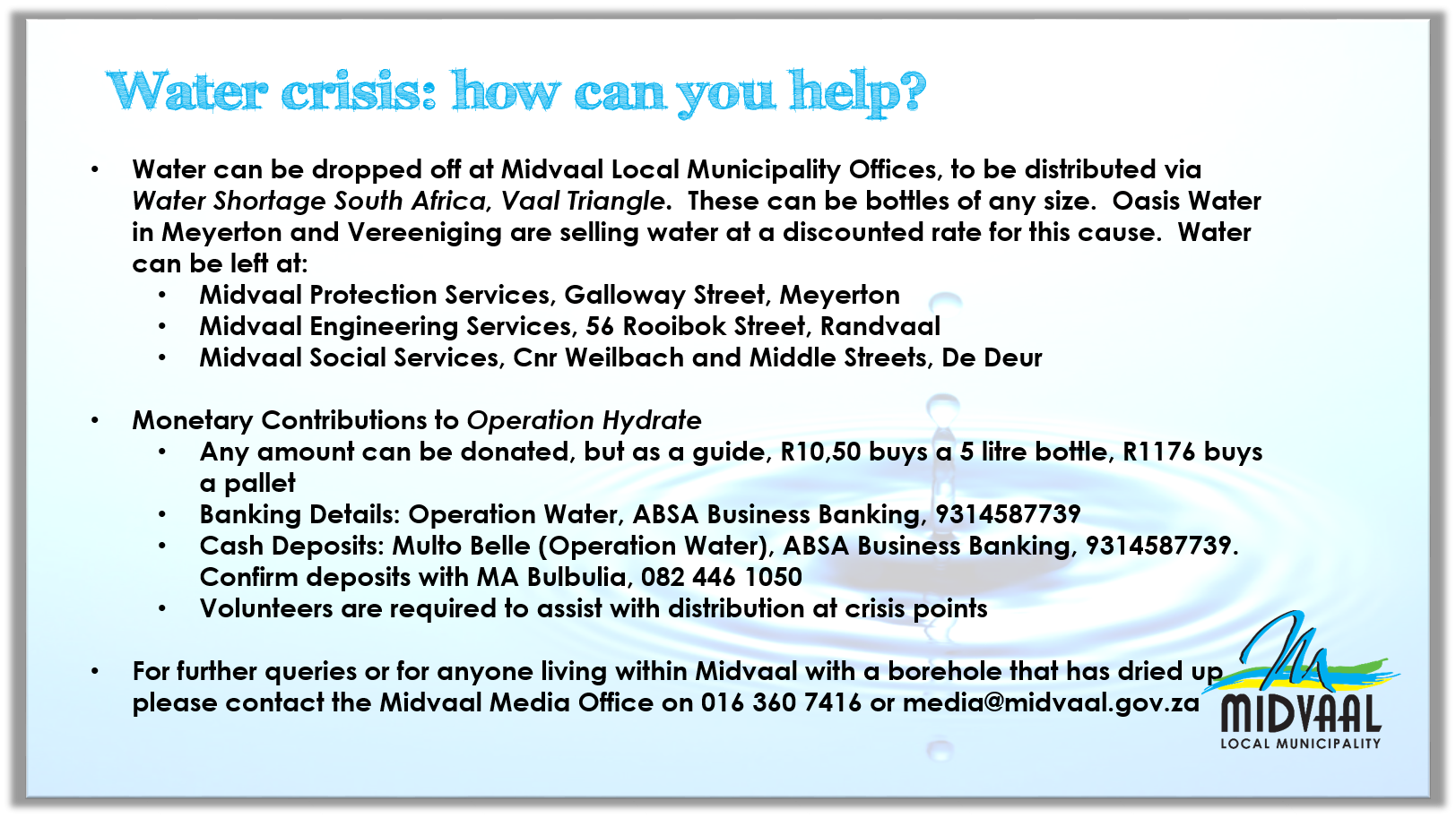 Home/Entertainment/Community urged to help with water crisis Entertainment Community urged to help with water crisis January 12, 2016 Less than a minute Facebook X LinkedIn Tumblr Pinterest WhatsApp Telegram Share via Email Print January 12, 2016 Less than a minute Facebook X LinkedIn Tumblr Pinterest WhatsApp Telegram Share via Email Print