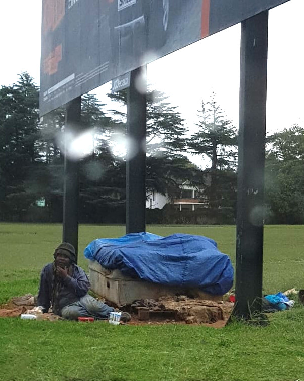 On the corner of Old Johannesburg Road and Ring Road a well-known homeless man is still residing under a billboard with his double bed.