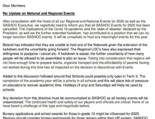 Skolehokkie is reeds vir die res van die jaar afgelas, maar daar sal eers ‘n besluit oor skolerugby en netbal geneem word sodra die Minster van Onderwys aangekondig het, wanneer skole gaan heropen.