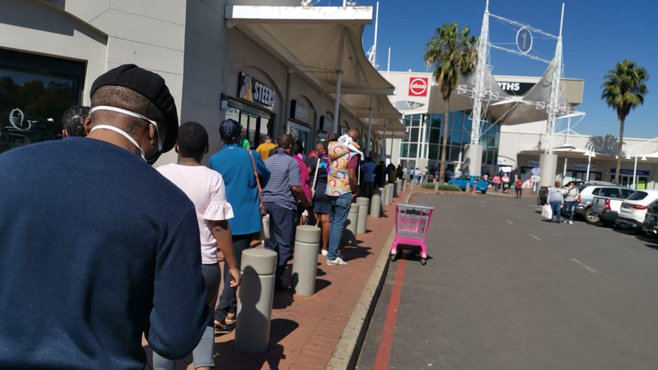 By River Square in Drie Riviere waar heelwat klerewinkels, selfoonwinkels en kitskosrestaurante (slegs vir aflewering) heropen het was lang rye mense buite die winkelsentrum sigbaar.
