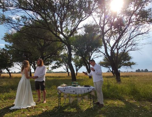 Wiehan en sy pa het die Saterdagoggend ‘n boom gaan soek in Eco Park waaronder die seremonie gehou kon word. Later het hulle die “kerk” gaan opstel wat bestaan het uit kampstoele en ‘n gedekte tafel met soortgelyke dekor (te danke aan sy ma en sussie) as wat hulle oorspronklik wou gebruik.