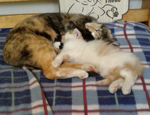Pippie nog as klein katjie by ma Spikkels. Pippie het intussen ‘n huiskat geword. Op die bordjie agter hulle staan: Have a heart and rescue a friend.