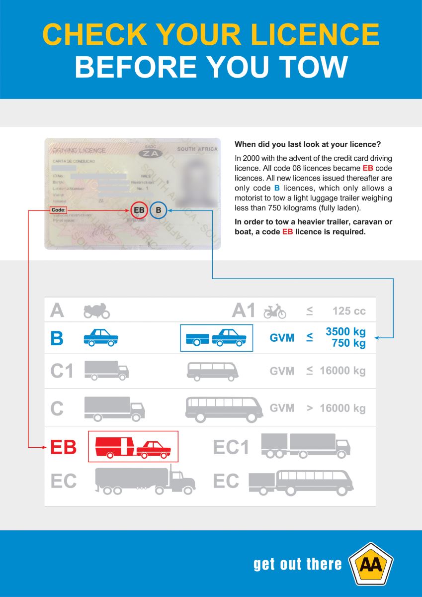 It is assumed by many drivers in South Africa that by passing their driver’s test, they are automatically qualified to tow, and while this was once the case, it has not been for a long time. In 2000 the government changed to the credit card type driving licences. When this happened, all code 08 licences were automatically converted to EB code licences. Since then, all new standard driving licences issued are only code B licences. What this means is that a Code B licence allows a motorist to tow a light luggage trailer weighing less than 750 kilogrammes (fully laden). To tow a heavier trailer, caravan or boat, a code EB licence is required.