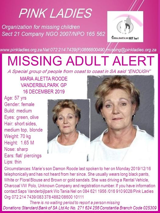 A missing persons case has been opened for a 57-year-old Vanderbijlpark woman, Maria Aletta Roode.