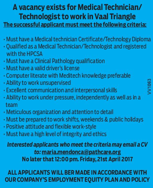 Medical Technician/Technologist wanted in Vaal